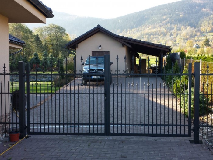 Křídlová otočná brána s kovanou výplní . Dvoukřídlá vjezdová brána s podzemními pohony.