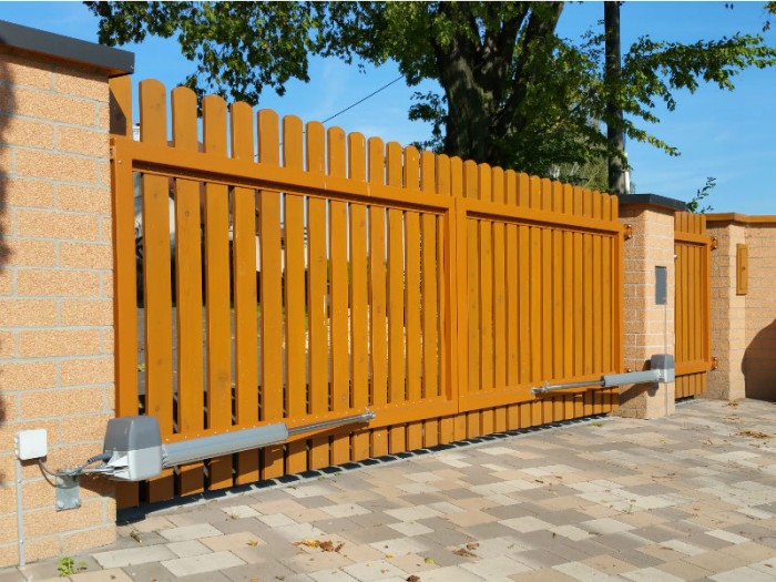 Křídlová otočná brána a vstupní branka s dřevěnou výplní . Dvoukřídlá vjezdová brána s podzemními pohony.