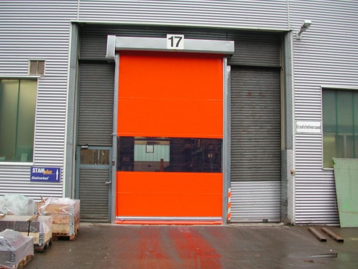 Rychloběžná fóliová průmyslová vrata s prosvětlovacím pásem. Rychlonavíjecí vrata.
