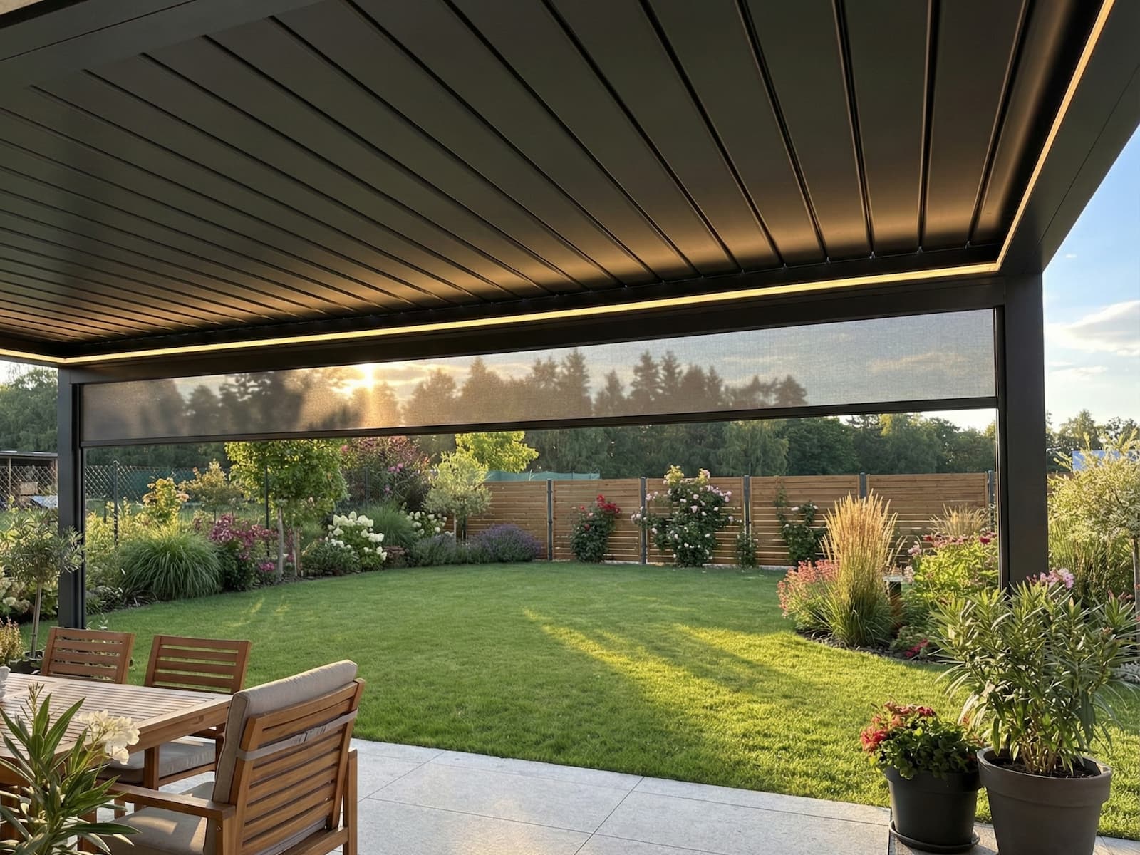 - Kontakt s okolím a denní soukromí: Přes den funguje technická tkanina podobně jako sluneční brýle nebo jednosměrné zrcadlo – vy si nerušeně užíváte výhled do zahrady, ale zvenčí dovnitř vidět není. Je však třeba pamatovat na fyziku: večer, když se venku setmí a vy v pergole rozsvítíte, se efekt obrací a vaše siluety budou zvenčí viditelné.