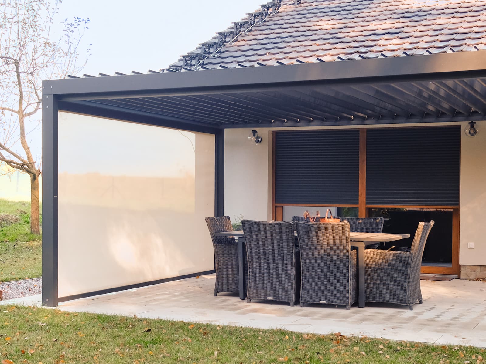 - Tepelná izolace v chladu: Díky výplni z PUR pěny roleta funguje jako izolační štít. To oceníte zejména při chladných letních večerech nebo na podzim. Pokud v pergole topíte zářiči nebo krbem, stažená roleta udrží drahocenné teplo uvnitř a vy si tak výrazně prodloužíte sezónu.