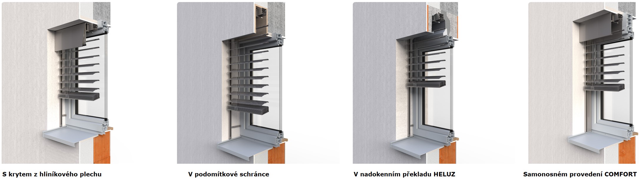 Venkovní žaluzie můžeme namontovat několika způsoby, vždy s ohledem na připravenost stavby. Pro novostavby nejčastěji volíme montáž pod omítku, pro starší stavby s hotovou fasádou jsou vhodné venkovní žaluzie s krytem z hliníkového plechu.