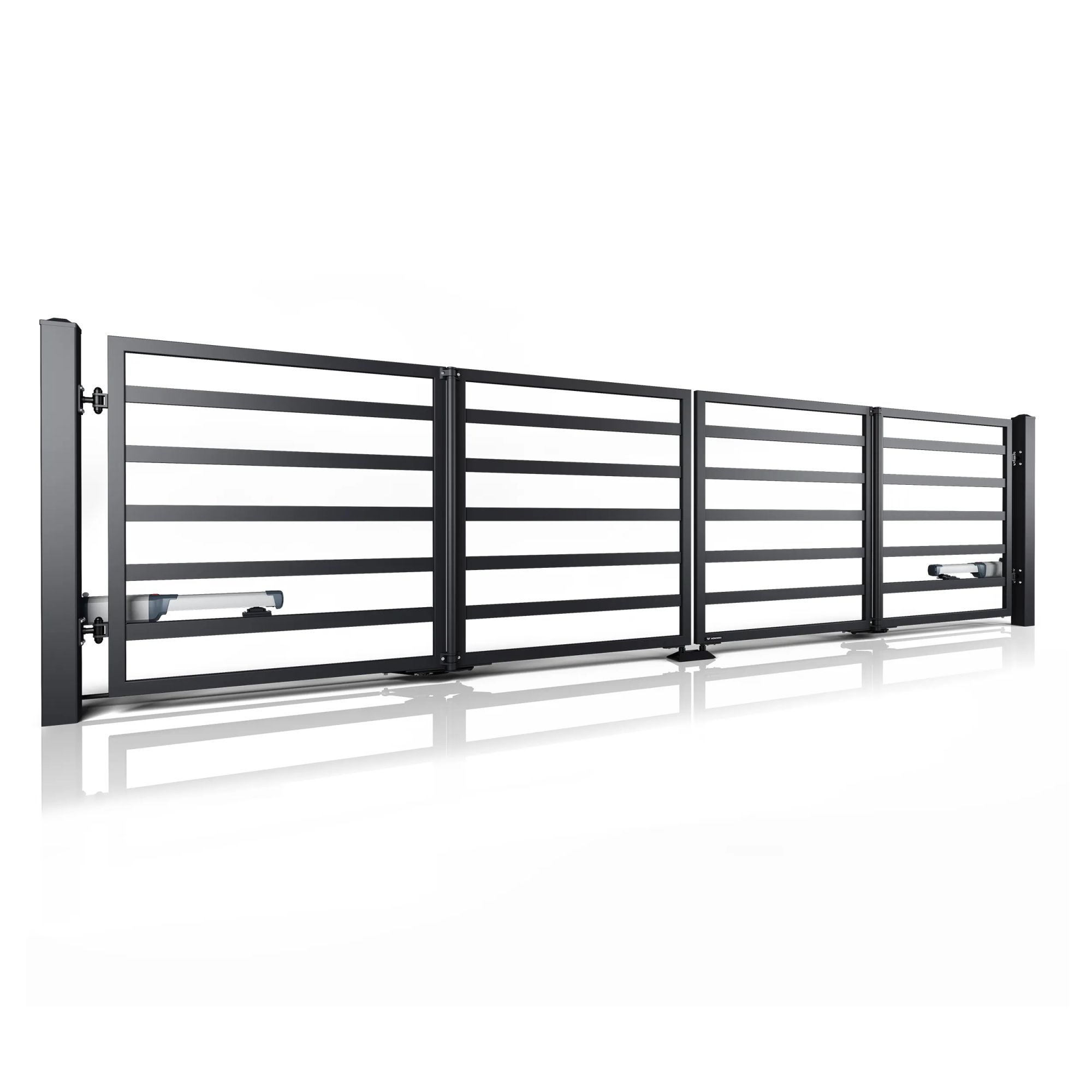 Křídla se při otevírání skládají „jako harmonika“ k bočním sloupkům. Tento důmyslný systém umožňuje využít větší hloubku vjezdu pro parkování auta. Skládací brány osazujeme výkonnými pohony, které zajišťují plynulý a bezpečný pohyb všech segmentů.