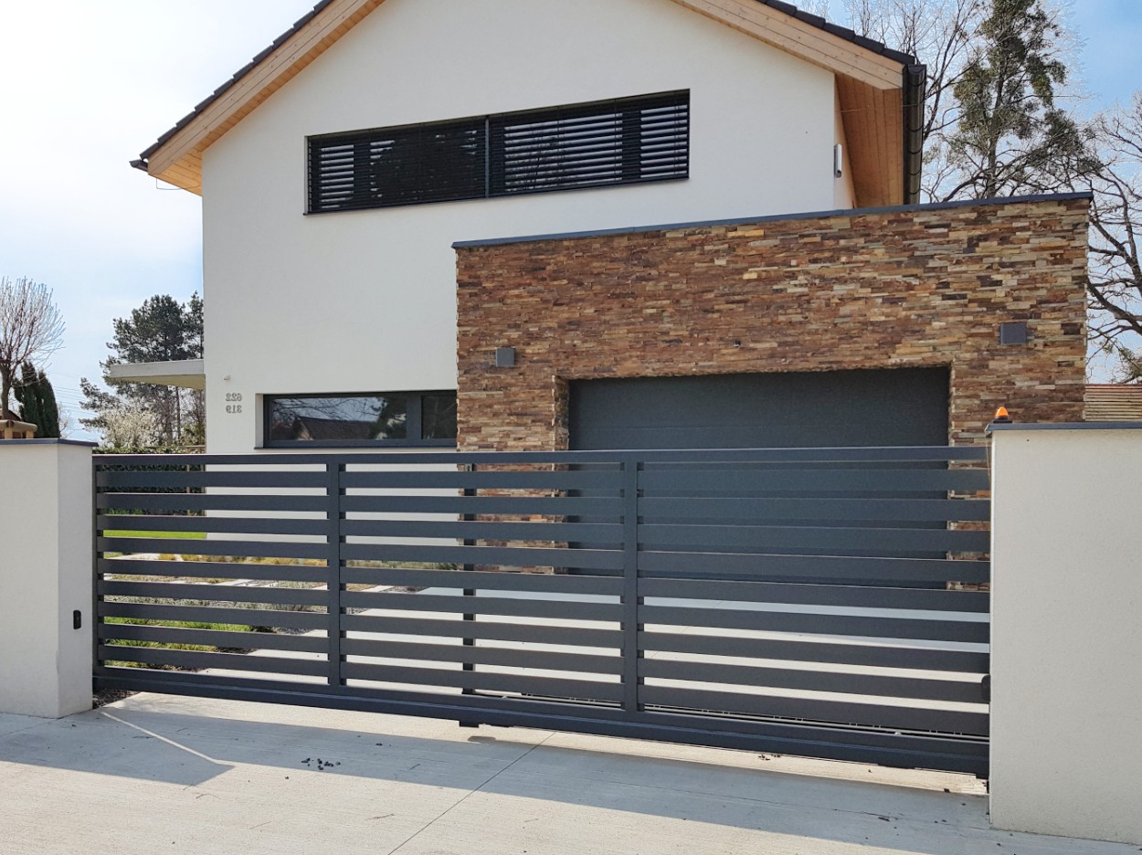 Teleskopická samonosná brána byla v tomto případě vyrobena pro šířku vjezdu 6m – výška 1,5m. Do ocelových obvodových rámů je vsazená svislá jaklová výplň, která se hezky doplňuje s architekturou stavby.