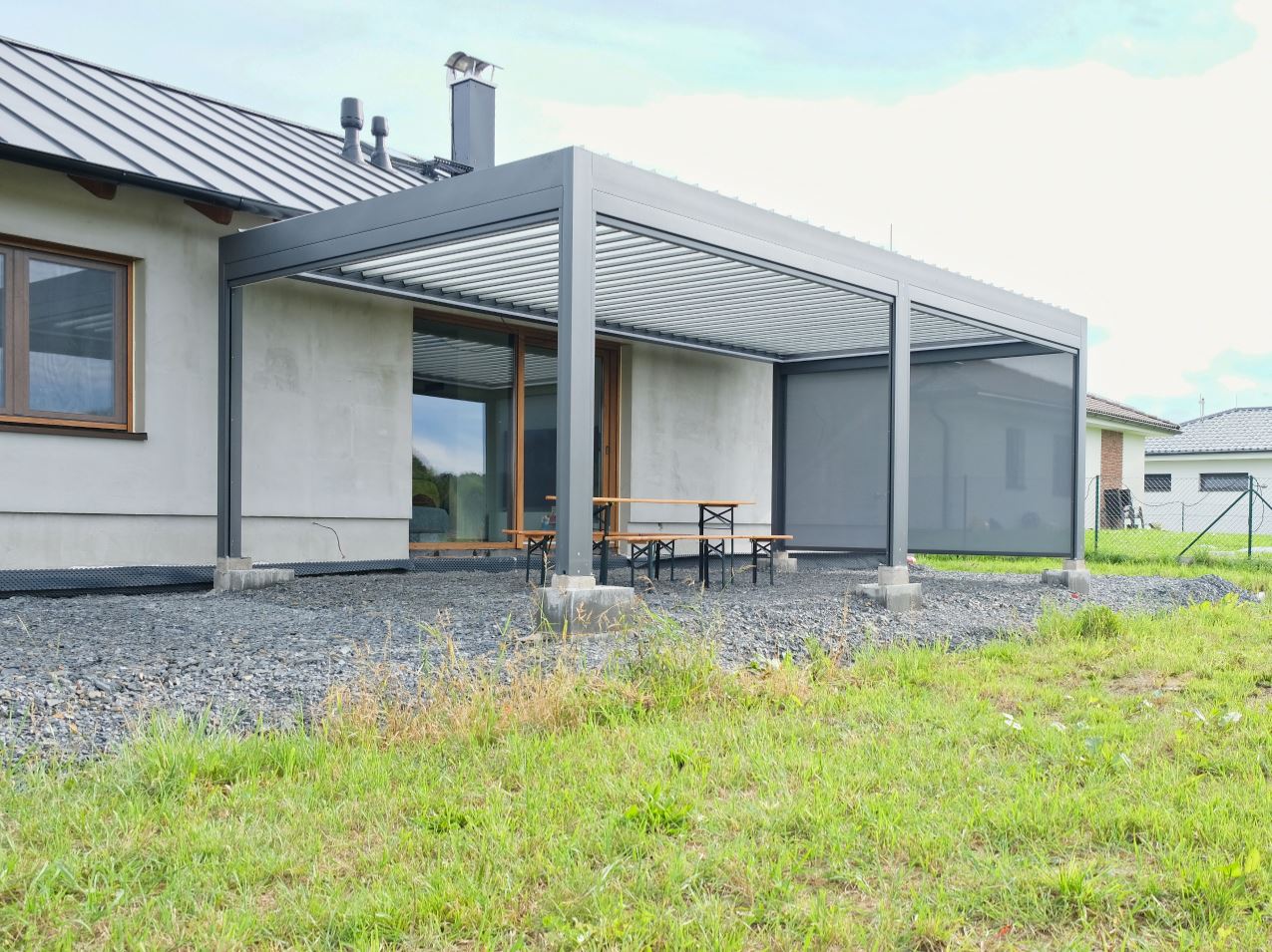 Konstrukce hliníkové pergoly a screenových rolet je ve standardním grafitovém odstínu, který hezky koresponduje se střešní krytinou. Pro pocit většího prostou a světla jsou střešní otočné lamely bioklimatické pergoly v odstínu krémové bílé. Ovládání pergoly a čtyř bočních stínících rolet zajišťuje jeden pěti-kanálový dálkový ovladač.