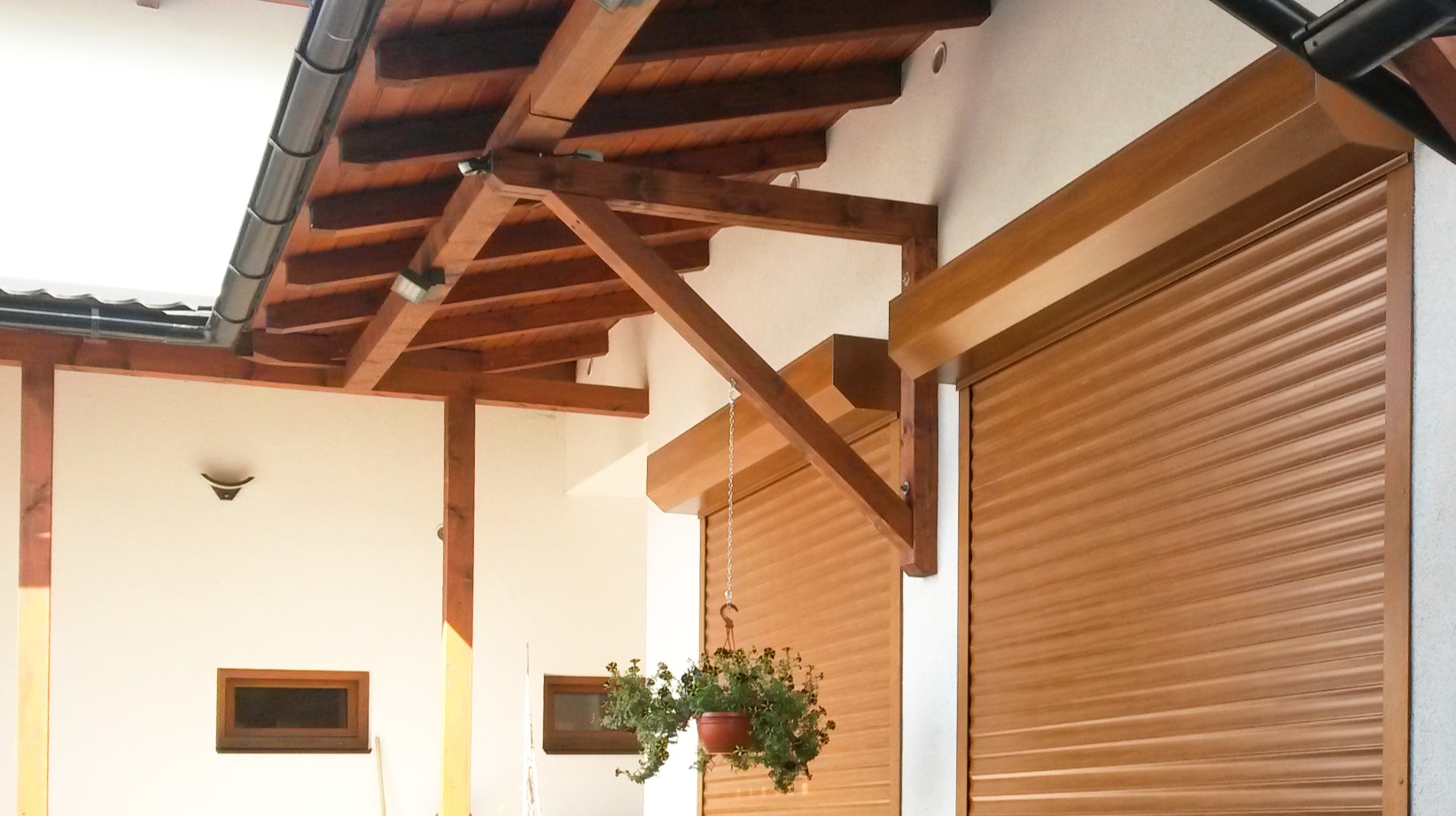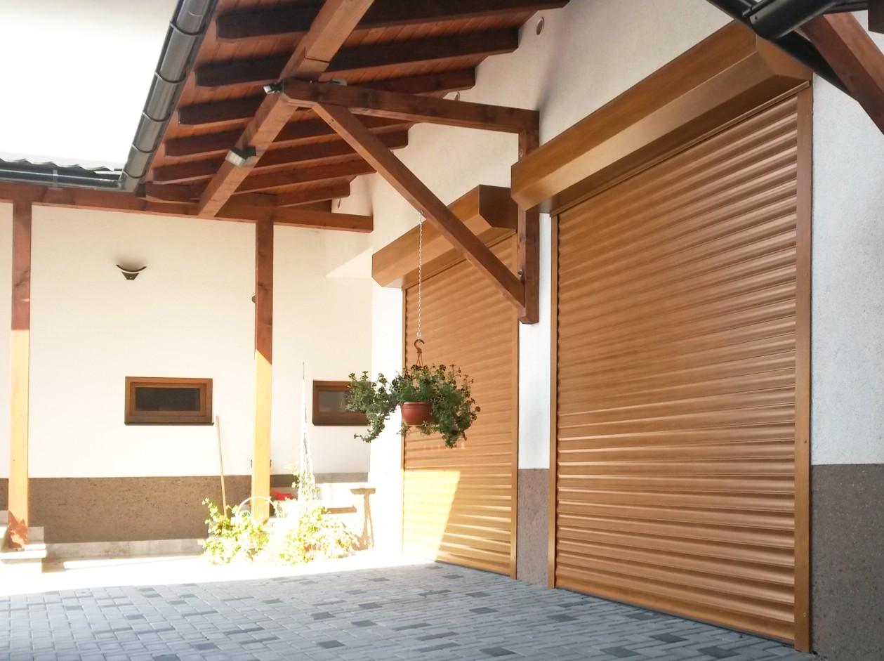 Nově instalovaná garážová rolovací vrata byla vyrobena z hliníkových zateplených lamel typu 77, vyplněných polyuretanovou pěnou. Tento typ lamel poskytuje velmi dobré tepelně-izolační vlastnosti, vysokou pevnost a dlouhou životnost. Odstín lamel ve dekoru zlatý dub byl zvolen s ohledem na architekturu objektu a přirozeně se doplňuje s barvou okenních rámů a domovních dveří, čímž vznikl jednotný a harmonický vzhled celé budovy. Ve stejném dekoru zlatý dub byly provedeny také kastlíky a vodicí lišty, což podtrhuje celkovou estetiku řešení.