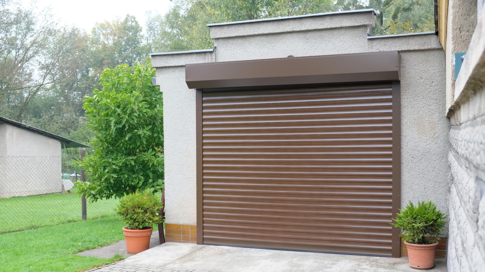 Nově instalovaná rolovací garážová vrata byla vyrobena z hliníkových zateplených lamel typu 77, vyplněných polyuretanovou pěnou. Odstín lamel v dekoru ořech dodává vratům přirozený a elegantní vzhled, který vizuálně připomíná dřevo, avšak s výhodami bezúdržbového hliníku. Pro dokonalé sladění s fasádou objektu byl kastlík a vodicí lišty provedeny v odstínu tmavě hnědá RAL 8019.