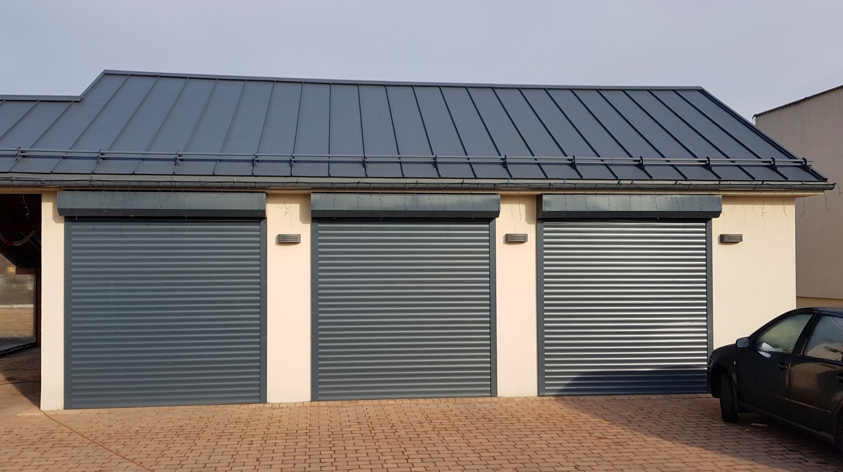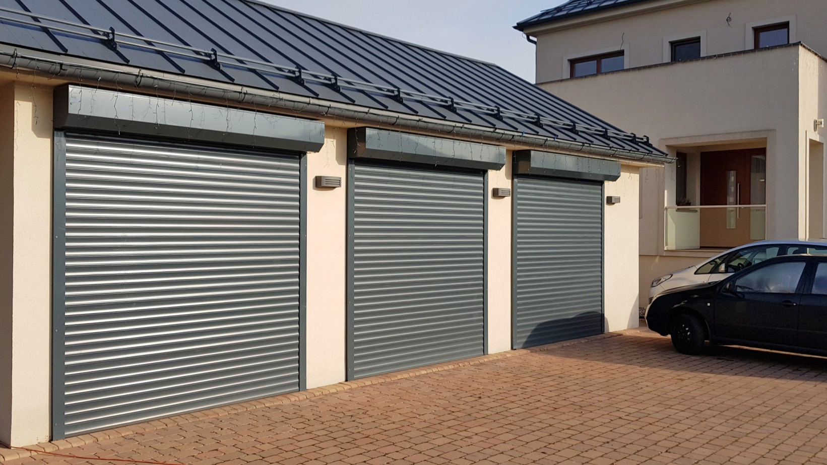 Ovládání všech tří roletových vrat je řešeno pomocí trubkového elektropohonu v kombinaci s dálkovým ovládáním, což zajišťuje pohodlný a bezpečný provoz. Součástí výbavy je také uzamykatelné nouzové ovládání, které umožňuje ruční otevření garážových vrat v případě výpadku elektrické energie a zároveň je chráněno proti neoprávněnému použití.